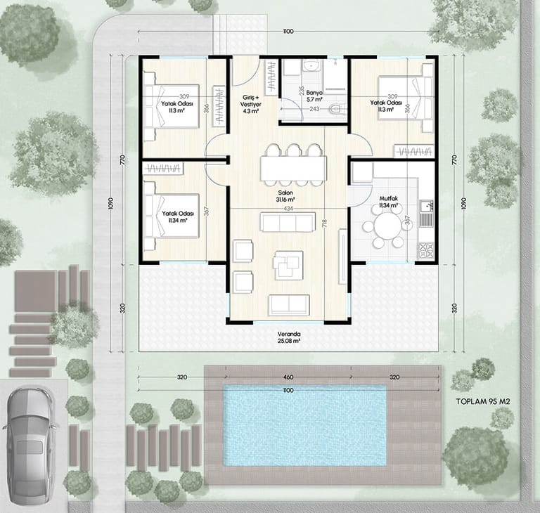 Çağdaş mimarinin en güzel örneklerinden biri olan bu modern prefabrik ev, geniş cam cepheleri sayesinde doğayla iç içe bir yaşam sunuyor. Ferah ve aydınlık yaşam alanı, zarif tasarımı ve bakım gerektirmeyen dış yüzeyiyle öne çıkan ev, konforlu bir oturma alanına ve şık ahşap yürüyüş yoluyla çevrelenmiş bakımlı bir bahçeye sahip. Aileler ve bireyler için ideal bir yaşam sunarken, yeşil bahçesinde keyifli vakit geçirebilirsiniz. Modern gri ve beyaz tonlarda tasarlanan bu enerji verimli prefabrik ev, yeni bir başlangıç için mükemmel bir tercih.